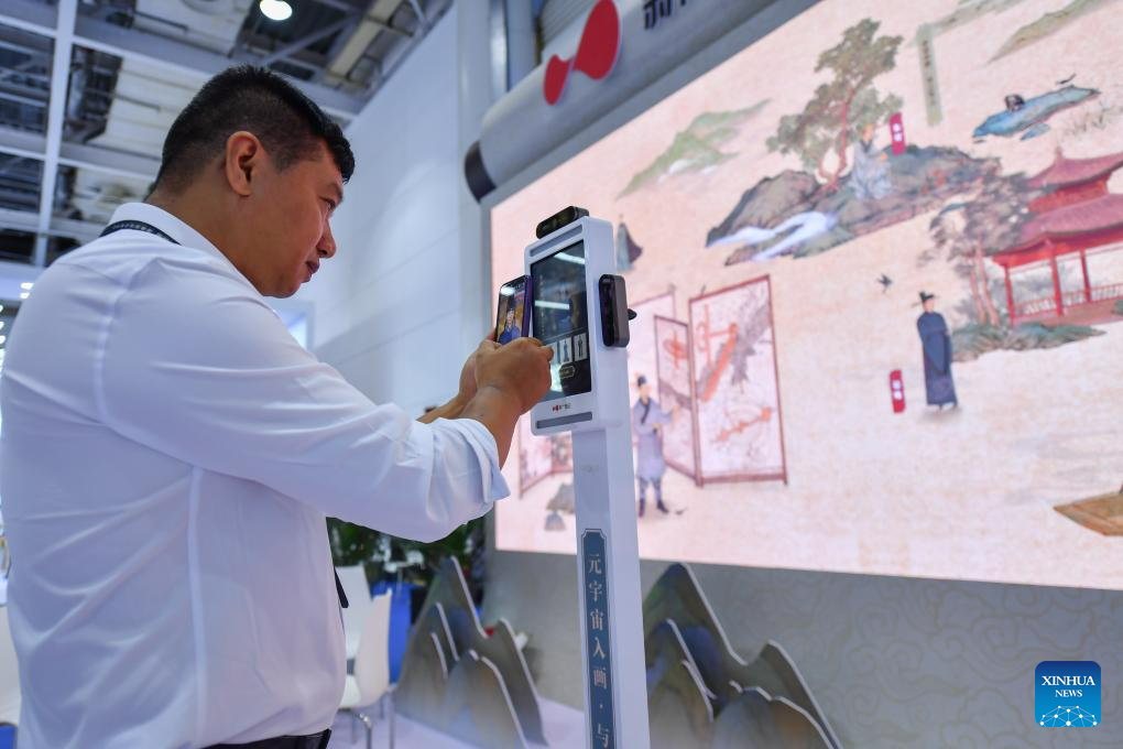 A participant visits the China New Media Technology Exhibition at the 2023 China New Media Conference in Changsha, central China's Hunan Province, July 12, 2023. More than 800 people, including representatives of central and local government departments, news organizations, online platforms and universities and institutions, attended the conference. (Xinhua/Chen Zeguo)