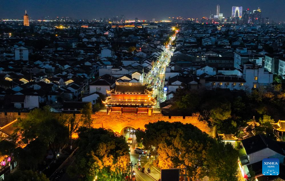 This aerial photo taken on April 10, 2023 shows the night view of the Changmen gate in Suzhou, east China's Jiangsu Province. Suzhou, a city with a history of over 2,500 years, is referred to as heaven on earth in a famous Chinese adage. (Xinhua/Li Bo)
