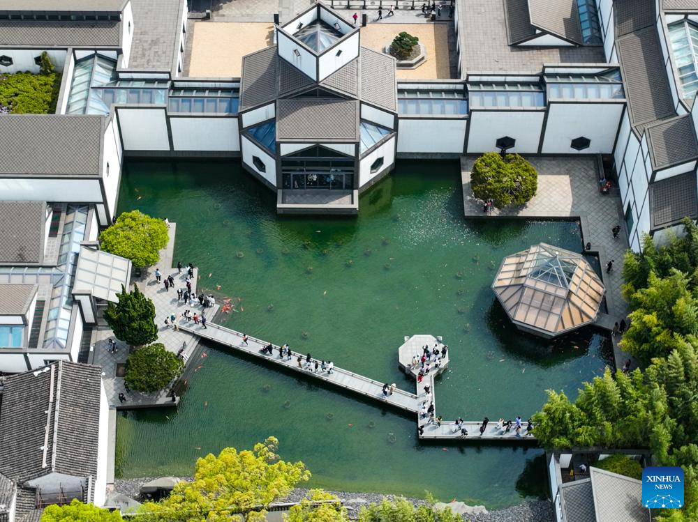 This aerial photo taken on April 5, 2023 shows people visiting Suzhou Museum in Suzhou, east China's Jiangsu Province. Suzhou, a city with a history of over 2,500 years, is referred to as heaven on earth in a famous Chinese adage. (Xinhua/Li Bo)