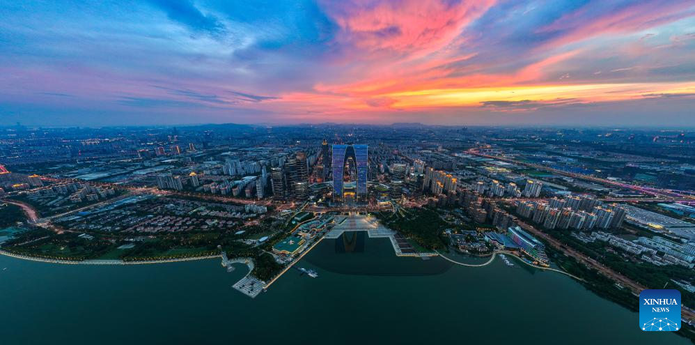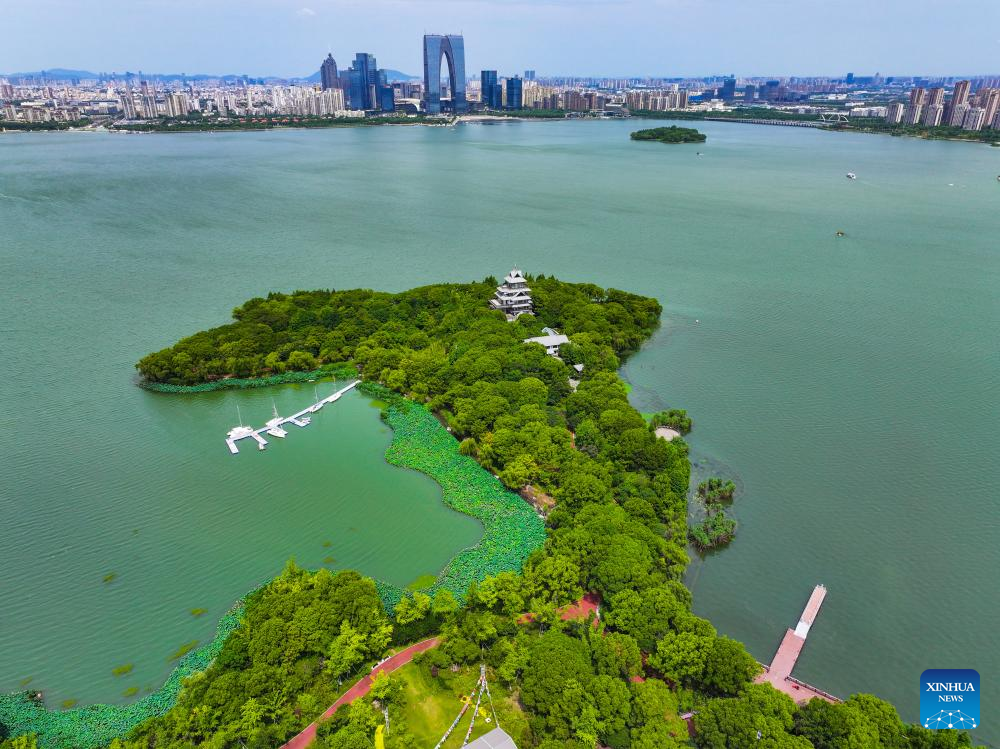 This aerial photo taken on July 4, 2023 shows a view by the Jinji Lake in Suzhou, east China's Jiangsu Province. Suzhou, a city with a history of over 2,500 years, is referred to as heaven on earth in a famous Chinese adage. (Xinhua/Li Bo)