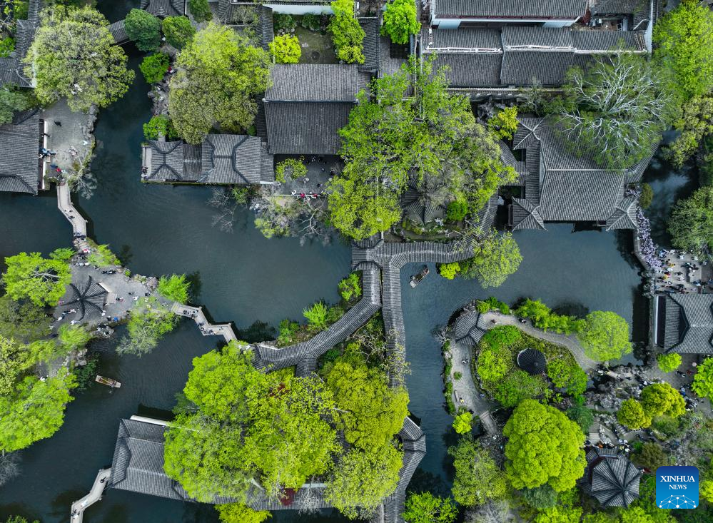 This aerial photo taken on April 5, 2023 shows a view of the Humble Administrator's Garden in Suzhou, east China's Jiangsu Province. Suzhou, a city with a history of over 2,500 years, is referred to as heaven on earth in a famous Chinese adage. (Xinhua/Li Bo)