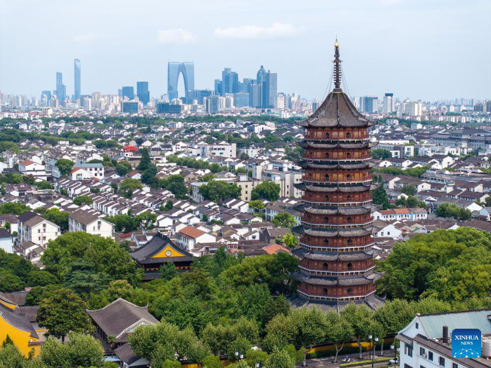 This aerial photo taken on July 4, 2023 shows the Beisi Pagoda in Suzhou, east China's Jiangsu Province. Suzhou, a city with a history of over 2,500 years, is referred to as heaven on earth in a famous Chinese adage. (Xinhua/Li Bo)