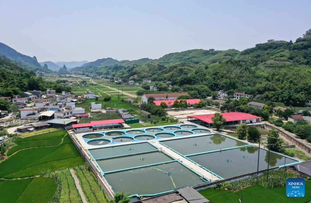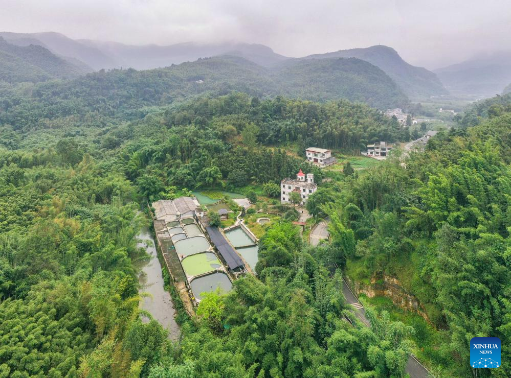This aerial photo taken on June 27, 2023 shows a breeding base jointly operated by Yibin Institute of Rare Aquatic Animals and Fisheries Institute of Sichuan Academy of Agricultural Sciences in Yibin, southwest China's Sichuan Province. (Xinhua/Wang Xi)