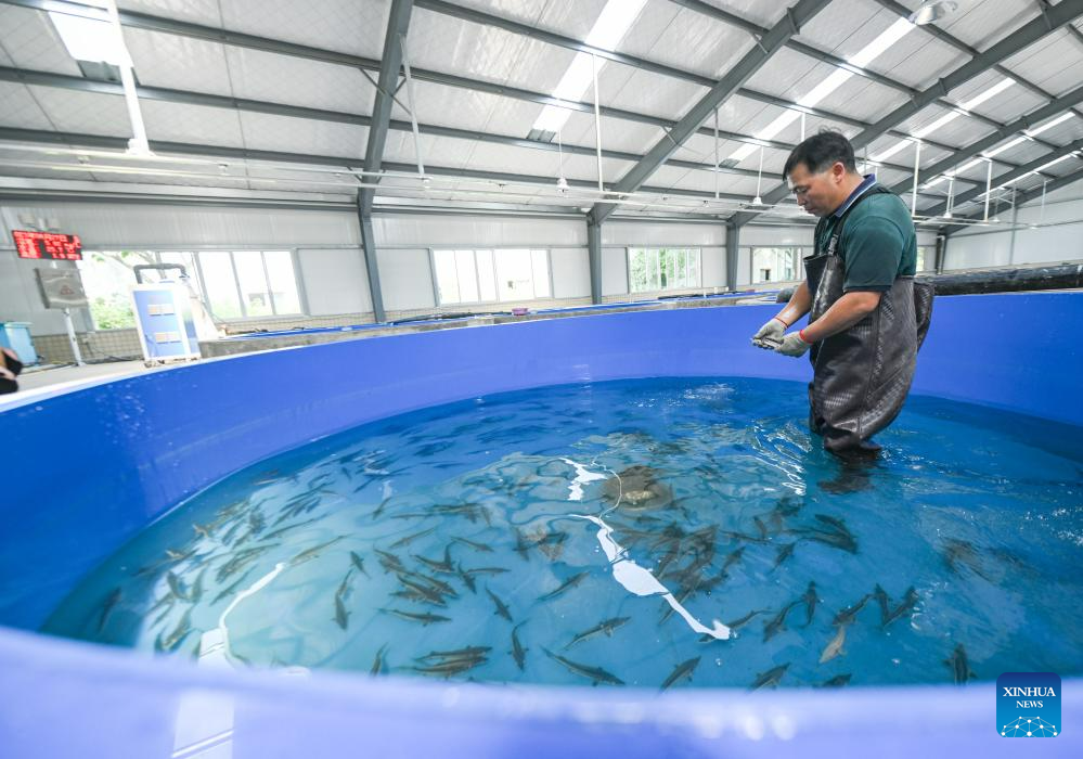 Zhou Liang checks juvenile fish of Yangtze sturgeon at a breeding base jointly operated by Yibin Institute of Rare Aquatic Animals and Fisheries Institute of Sichuan Academy of Agricultural Sciences in Yibin, southwest China's Sichuan Province, June 27, 2023. (Xinhua/Wang Xi)