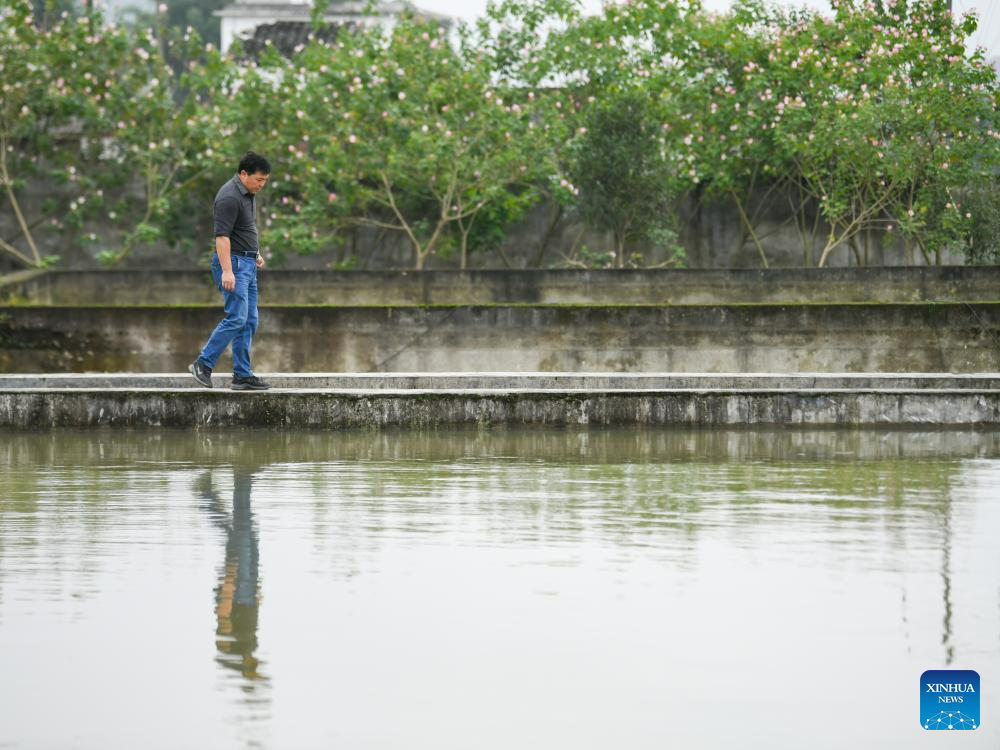 Zhou Liang checks the fishpond at a breeding base jointly operated by Yibin Institute of Rare Aquatic Animals and Fisheries Institute of Sichuan Academy of Agricultural Sciences in Yibin, southwest China's Sichuan Province, Oct. 12, 2021. (Xinhua/Wang Xi)