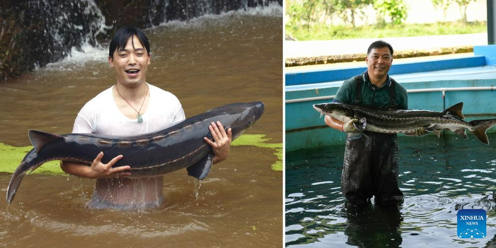 Zhou Liang displays a Yangtze sturgeon at a breeding base jointly operated by Yibin Institute of Rare Aquatic Animals and Fisheries Institute of Sichuan Academy of Agricultural Sciences in Yibin, southwest China's Sichuan Province, June 27, 2023. (Xinhua/Xu Bingjie)
