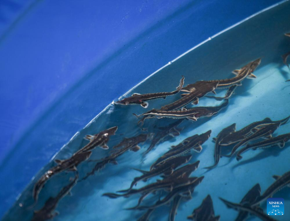 This photo taken on June 27, 2023 shows juvenile fish of Yangtze sturgeon at a breeding base jointly operated by Yibin Institute of Rare Aquatic Animals and Fisheries Institute of Sichuan Academy of Agricultural Sciences in Yibin, southwest China's Sichuan Province. (Xinhua/Wang Xi)