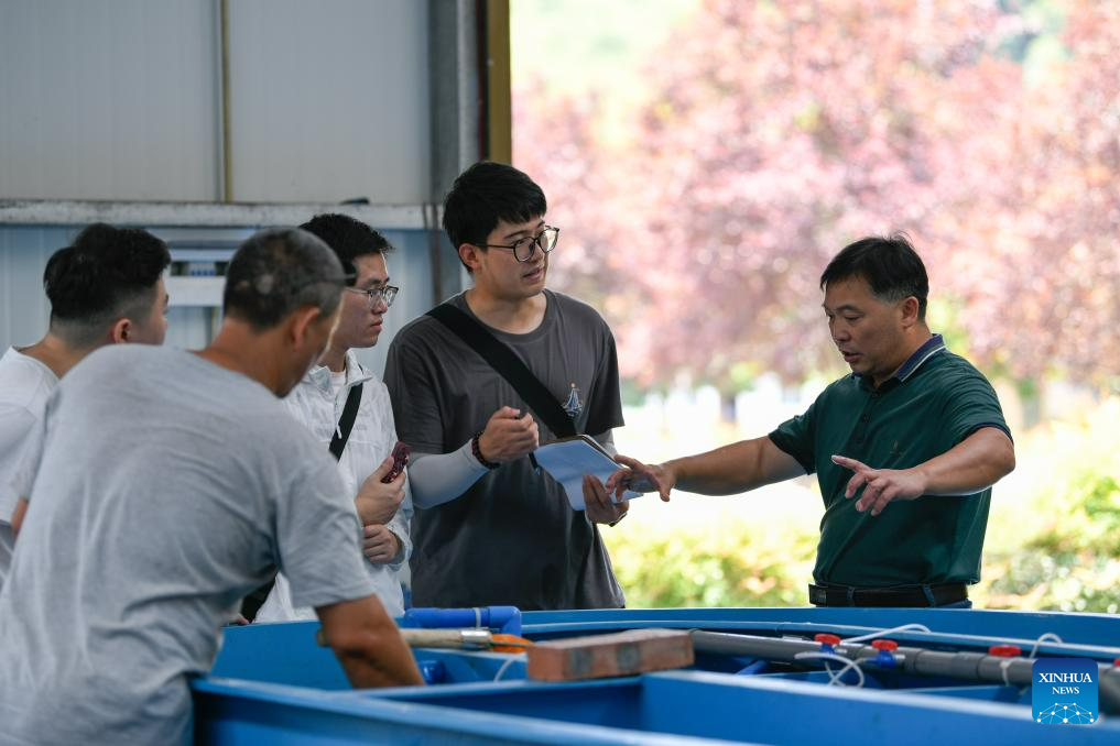 Zhou Liang (1st R) talks with visiting students from China Three Gorges University at a breeding base jointly operated by Yibin Institute of Rare Aquatic Animals and Fisheries Institute of Sichuan Academy of Agricultural Sciences in Yibin, southwest China's Sichuan Province, June 27, 2023. (Xinhua/Xu Bingjie)