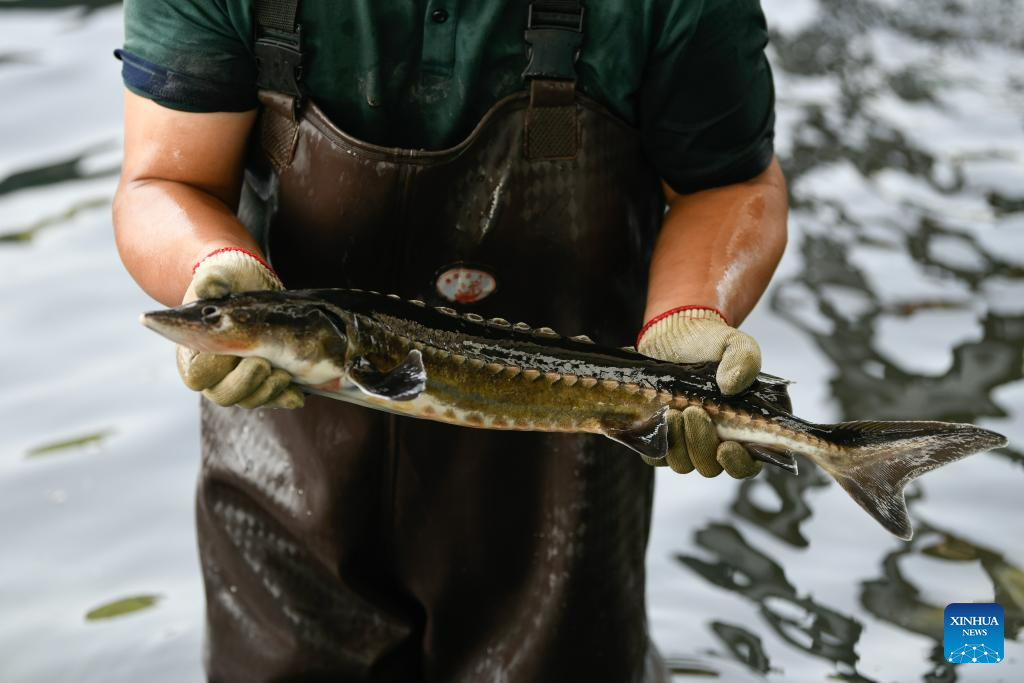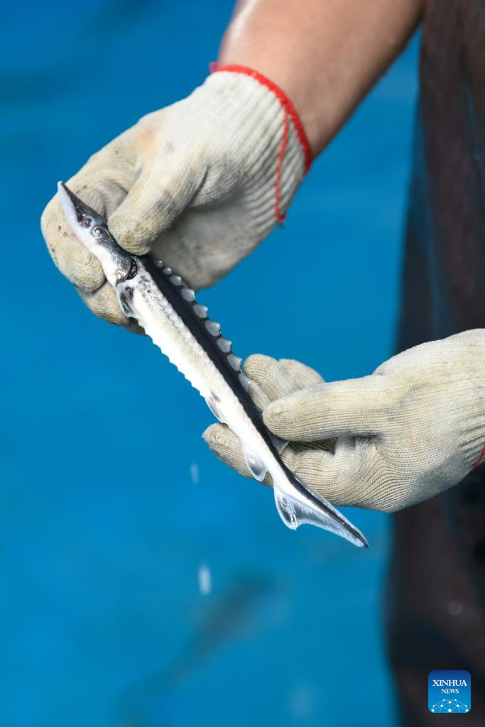 Zhou Liang shows a juvenile fish of Yangtze sturgeon at a breeding base jointly operated by Yibin Institute of Rare Aquatic Animals and Fisheries Institute of Sichuan Academy of Agricultural Sciences in Yibin, southwest China's Sichuan Province, June 27, 2023. (Xinhua/Xu Bingjie)