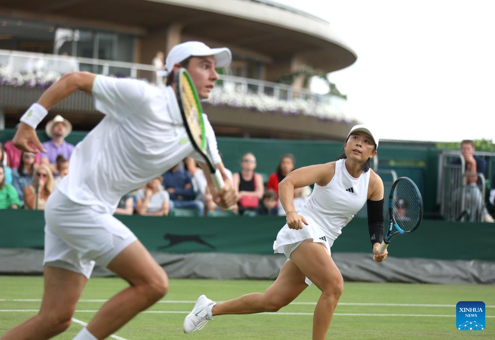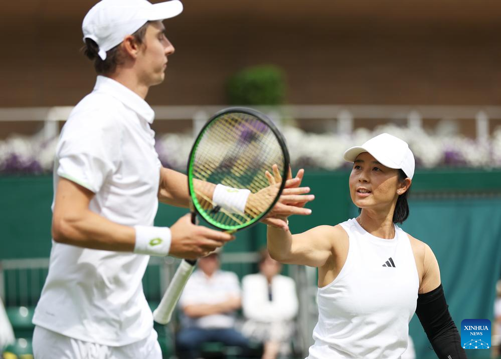 Xu Yifan (R)/Joran Vliegen compete during the mixed doubles semifinal match between Xu Yifan (China)/Joran Vliegen (Belgium) and Matwe Middelkoop (the Netherlands)/Aldila Sutjiadi (Indonesia) at Wimbledon tennis Championship in London, Britain, July 12, 2023. (Xinhua/Li Ying)