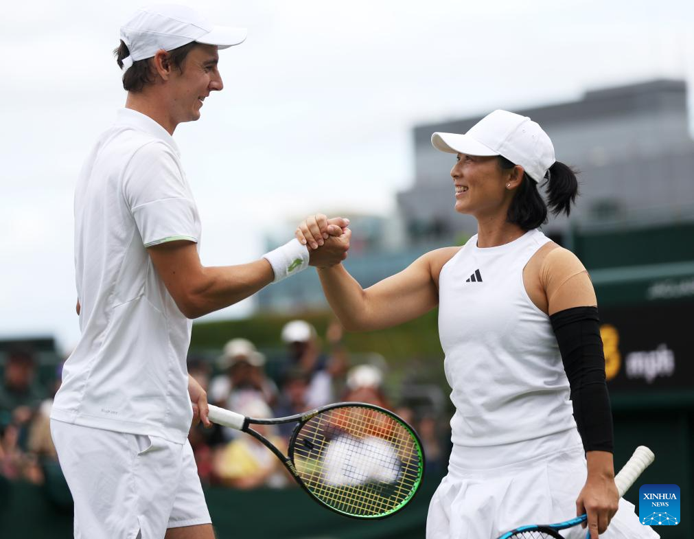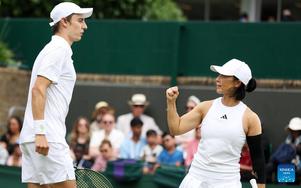 Xu Yifan (R)/Joran Vliegen celebrate scoring during the mixed doubles semifinal match between Xu Yifan (China)/Joran Vliegen (Belgium) and Matwe Middelkoop (the Netherlands)/Aldila Sutjiadi (Indonesia) at Wimbledon tennis Championship in London, Britain, July 12, 2023. (Xinhua/Li Ying)