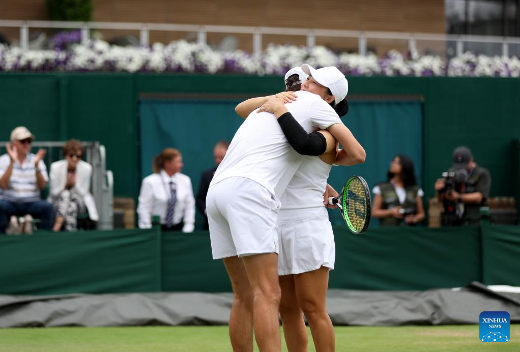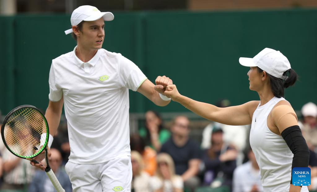 Xu Yifan (R)/Joran Vliegen celebrate after winning the mixed doubles semifinal match between Xu Yifan (China)/Joran Vliegen (Belgium) and Matwe Middelkoop (the Netherlands)/Aldila Sutjiadi (Indonesia) at Wimbledon tennis Championship in London, Britain, July 12, 2023. (Xinhua/Li Ying)