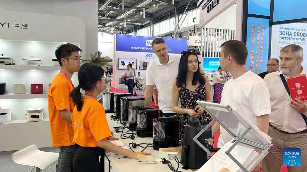 Visitors talk with Chinese exhibitors at the 7th China-Russia Expo in Yekaterinburg, Russia, July 11, 2023. The 7th China-Russia Expo will last till July 13. (Xinhua/Huang He)