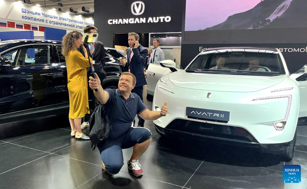 A visitor poses for a photo with a vehicle displayed by Chinese enterprise at the 7th China-Russia Expo in Yekaterinburg, Russia, July 11, 2023. The 7th China-Russia Expo will last till July 13. (Xinhua/Zhao Bing)