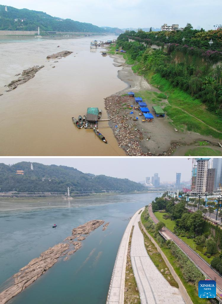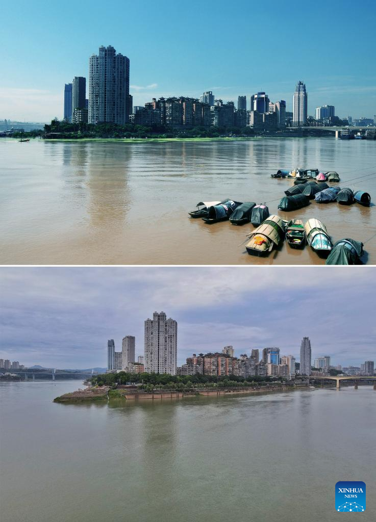 The above part of this combination photo taken by Zeng Lang in July 2014 shows a view along the Yangtze River in Yibin, southwest China's Sichuan Province, before an ecological improvement project. The lower part taken by Xinhua photographer Xu Bingjie shows a scenery along the Yangtze River in Yibin on June 26, 2023. In the past decade, Yibin and Luzhou of southwest China's Sichuan Province have made great efforts in improving ecological environment of the Yangtze River. (Xinhua)