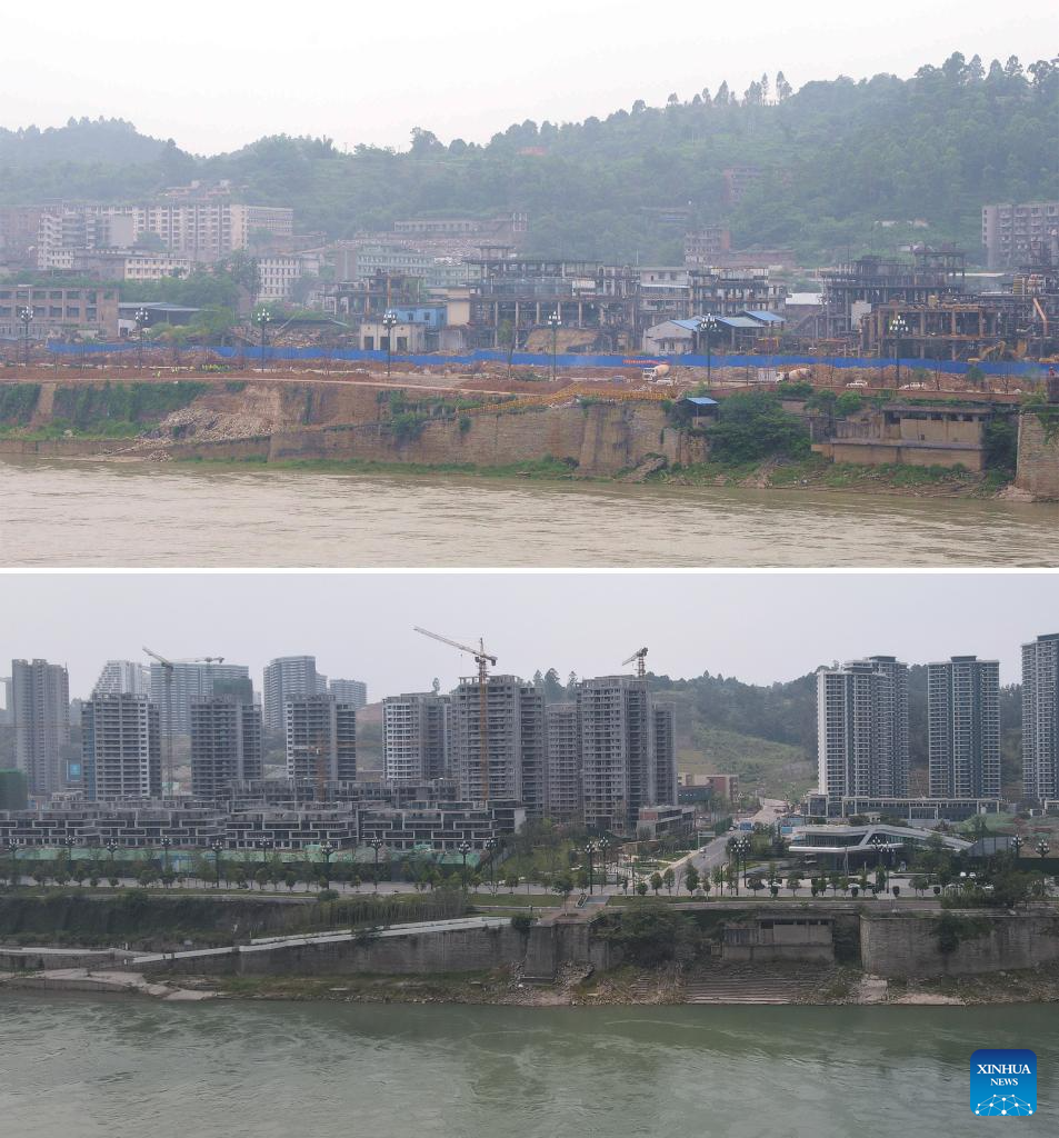 The above part of this combination photo taken by Xinhua photographer Hu Xu shows an old chemical factory in Yibin being dismantled on June 22, 2018. The lower part taken by Xinhua photographer Liu Kun shows an aerial view of the site of the factory on May 31, 2023. In the past decade, Yibin and Luzhou of southwest China's Sichuan Province have made great efforts in improving ecological environment of the Yangtze River. (Xinhua)