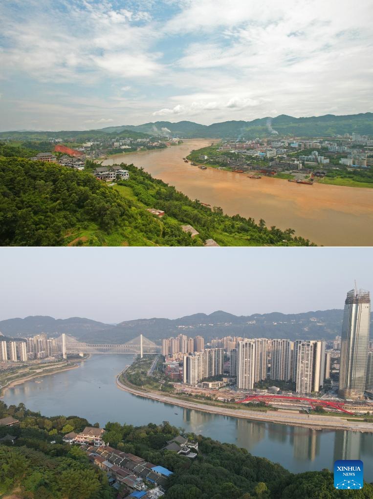 The above part of this combination photo taken by Cao Weibing in July 2012 shows fishing boats berthing at Guanyizui, where the Tuojiang River and the Yangtze River converge in Luzhou City of southwest China's Sichuan Province. The lower part taken by Xinhua photographer Liu Kun shows a scenery of Guanyizui on June 1, 2023. In the past decade, Yibin and Luzhou of southwest China's Sichuan Province have made great efforts in improving ecological environment of the Yangtze River. (Xinhua)