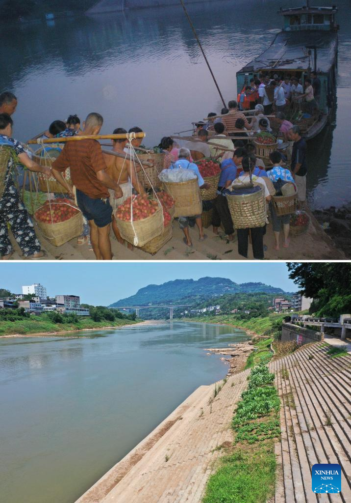 The above part of this combination photo taken in 2014 shows farmers boarding a ferry with litchi at Sanjiang dock in Hejiang County of Luzhou, southwest China's Sichuan Province. The lower part taken by Xinhua photographer Liu Kun on June 27, 2023 shows the deserted Sanjiang dock and the nearby Sanjiangju Bridge which has been put into use. In the past decade, Yibin and Luzhou of southwest China's Sichuan Province have made great efforts in improving ecological environment of the Yangtze River. (Xinhua)