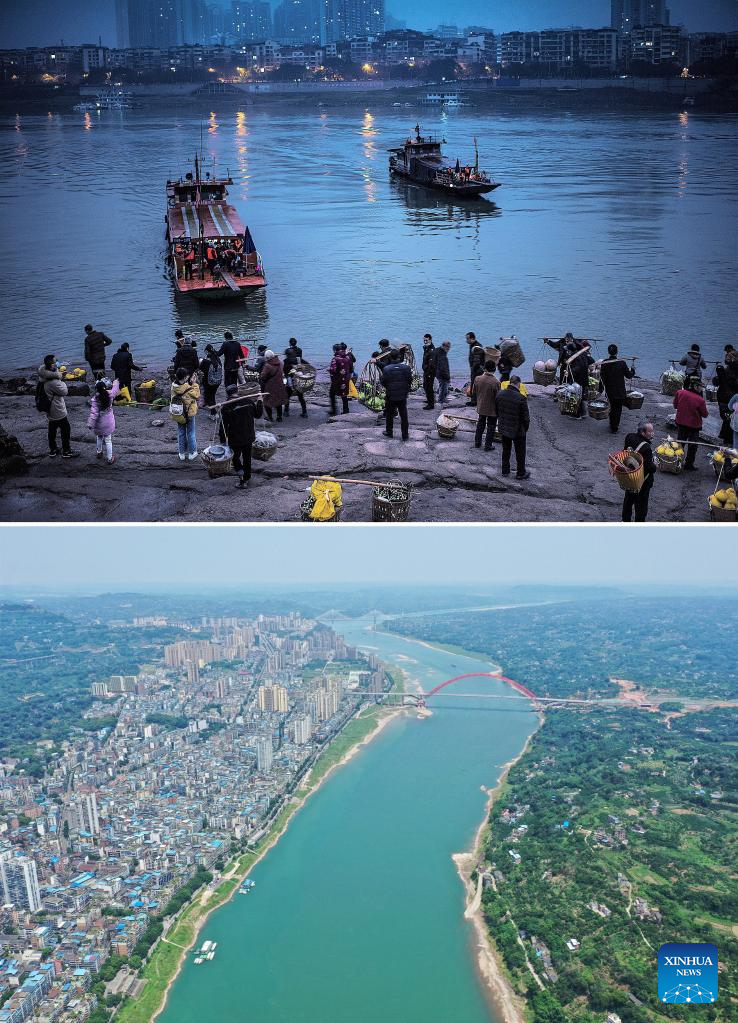 The above part of this combination photo taken by Cao Weibing on Jan. 27, 2021 shows people waiting for the ferry on a dock in Hejiang County of Luzhou, southwest China's Sichuan Province. The lower part taken by Xinhua photographer Liu Kun shows an aerial view of Hejiang county seat and a Yangtze River bridge on June 27, 2023. In the past decade, Yibin and Luzhou of southwest China's Sichuan Province have made great efforts in improving ecological environment of the Yangtze River. (Xinhua)