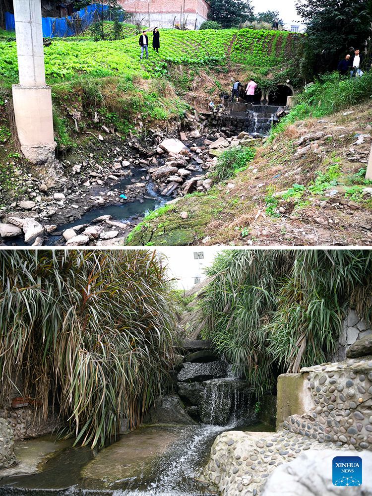 The above part of this combination photo shows the Laoyingqiu sewage pipeline (file photo) before renovation in Luzhou, southwest China's Sichuan Province. The lower part taken by Xinhua photographer Xu Bingjie on June 1, 2023 shows the sewage pipeline after renovation. In the past decade, Yibin and Luzhou of southwest China's Sichuan Province have made great efforts in improving ecological environment of the Yangtze River. (Xinhua)