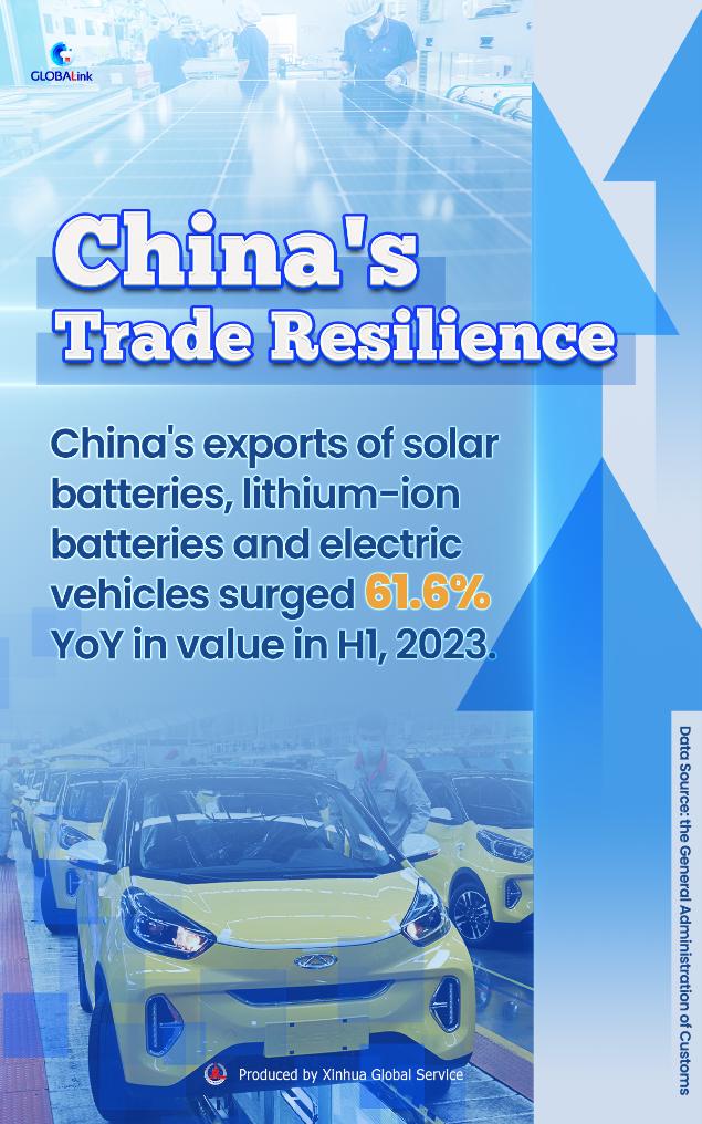 The total export value of China's three major tech-intensive green products -- solar batteries, lithium-ion batteries, and electric vehicles -- soared 61.6 percent year on year in the first half of 2023.