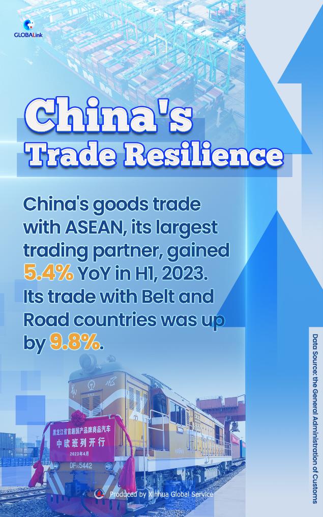The Association of Southeast Asian Nations remained China's biggest trading partner in the first half of the year, with the two sides' trade in goods rising 5.4 percent year on year to 3.08 trillion yuan. The value accounted for 15.3 percent of China's total foreign trade value during this period.