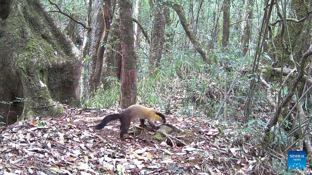 This photo taken by an infrared camera on March 23, 2022 shows a yellow-throated marten in Gaoligong Mountain National Nature Reserve, southwest China's Yunnan Province. As one of the global biodiversity hotspots, the Gaoligong Mountains are home to about 17 percent of higher plants, about 30 percent of mammals and 35 percent of birds in China in terms of the number of species. (Xinhua)