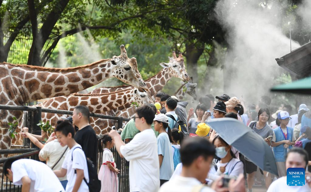 Giraffes are cooled off under water spray at the Guangzhou Zoo in Guangzhou, south China's Guangdong Province, July 13, 2023. The zoo has taken various measures to cool the animals during the summer heat in Guangzhou. (Xinhua/Deng Hua)