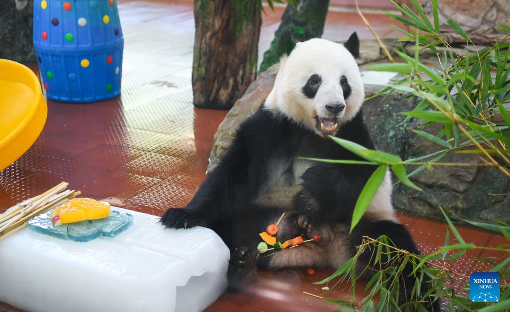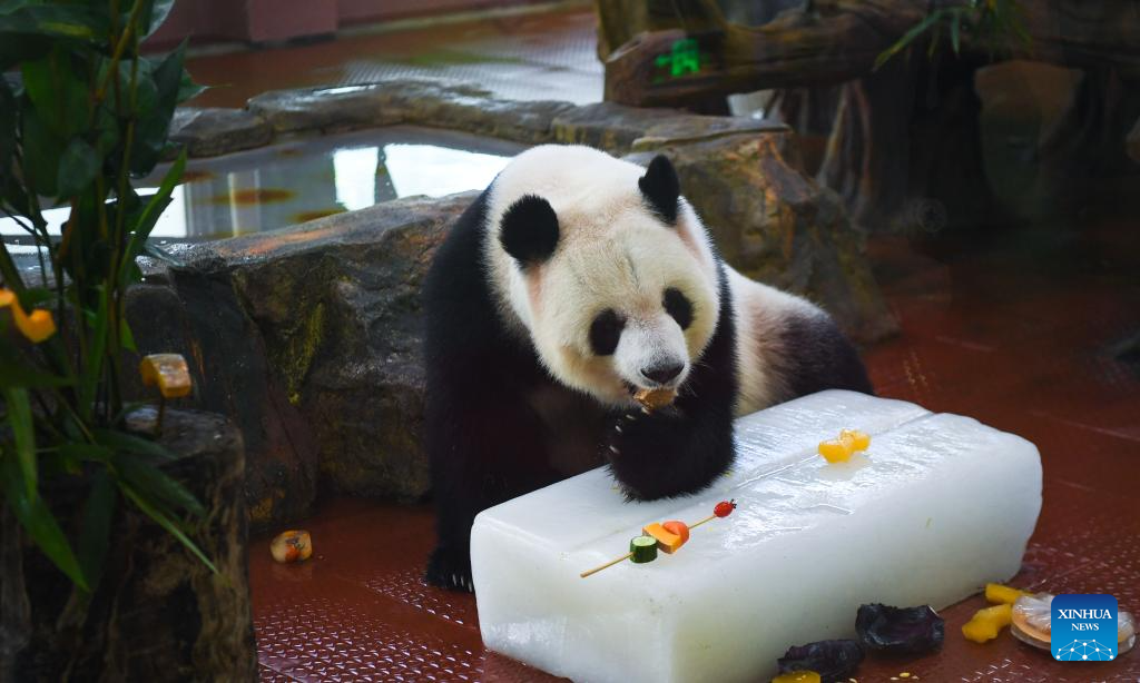 A giant panda enjoys iced fruits at the Guangzhou Zoo in Guangzhou, south China's Guangdong Province, July 13, 2023. The zoo has taken various measures to cool the animals during the summer heat in Guangzhou. (Xinhua/Deng Hua)