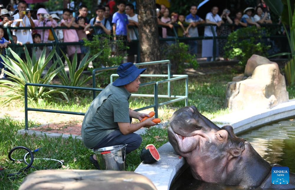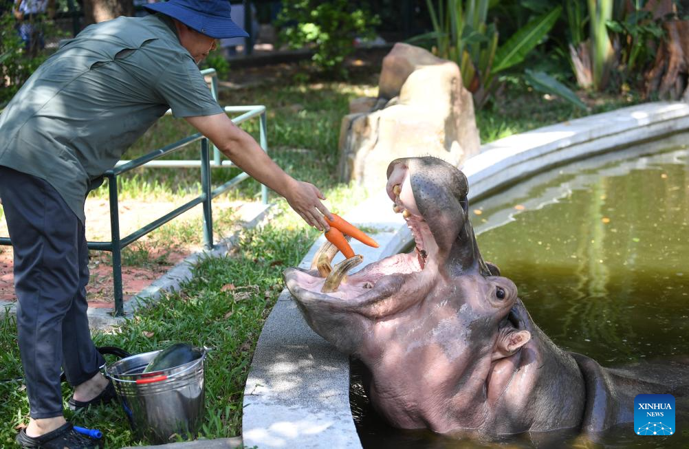 A breeder feeds a hippo with fresh carrots and watermelon at the Guangzhou Zoo in Guangzhou, south China's Guangdong Province, July 13, 2023. The zoo has taken various measures to cool the animals during the summer heat in Guangzhou. (Xinhua/Deng Hua)