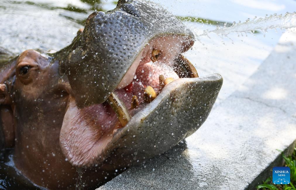 A breeder cools a hippo with spray at the Guangzhou Zoo in Guangzhou, south China's Guangdong Province, July 13, 2023. The zoo has taken various measures to cool the animals during the summer heat in Guangzhou. (Xinhua/Deng Hua)