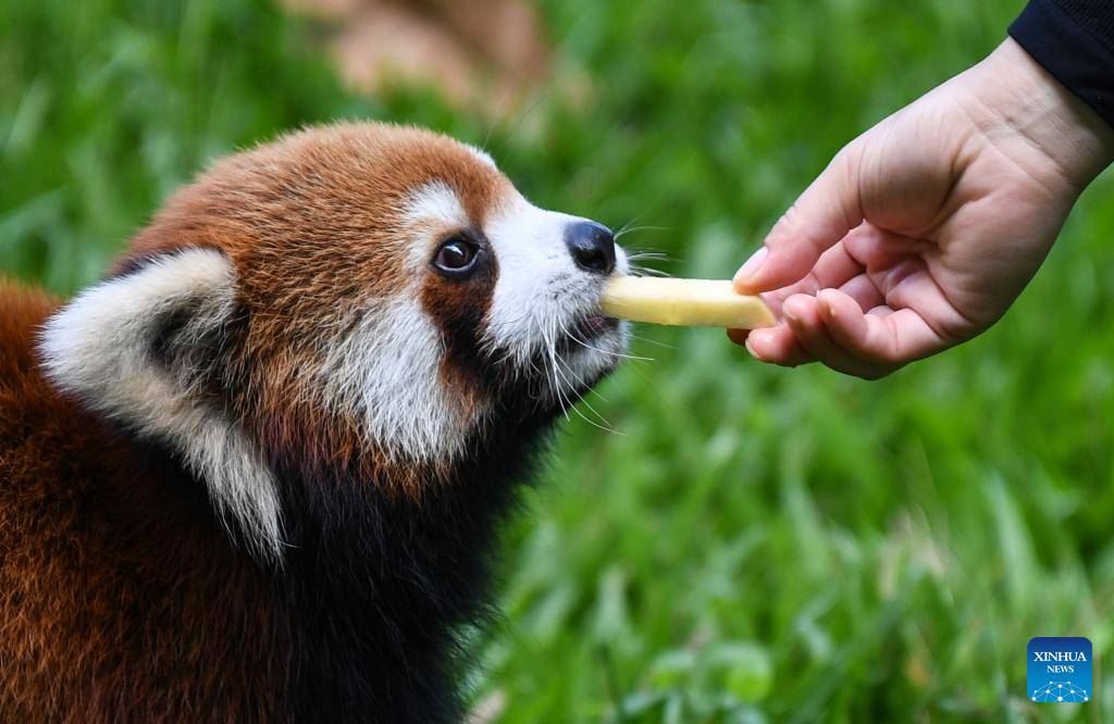 A breeder feeds a red panda with fresh fruit at the Guangzhou Zoo in Guangzhou, south China's Guangdong Province, July 13, 2023. The zoo has taken various measures to cool the animals during the summer heat in Guangzhou. (Xinhua/Deng Hua)