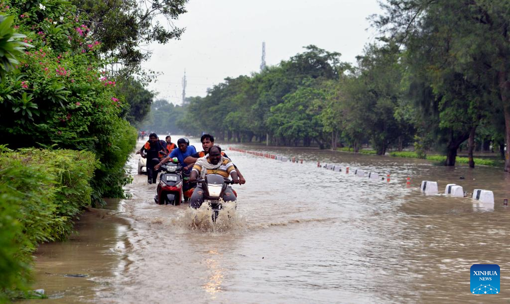 People wade on a flooded road in New Delhi, India, July 13, 2023. The water level of river Yamuna, which passes through New Delhi, continues to remain above the danger mark, posing fear of floods, particularly in low-lying areas of the city. (Str/Xinhua)