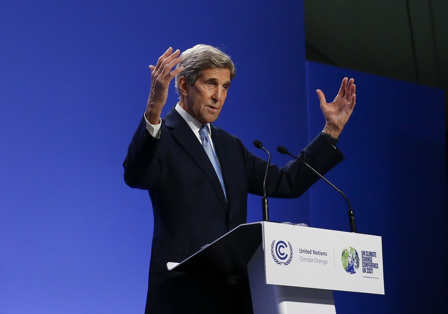 John Kerry, U.S. special presidential envoy for climate, speaks at a press conference during the 26th session of the Conference of the Parties (COP26) to the United Nations Framework Convention on Climate Change in Glasgow, Scotland, the United Kingdom, on Nov. 10, 2021. (Xinhua/Han Yan)