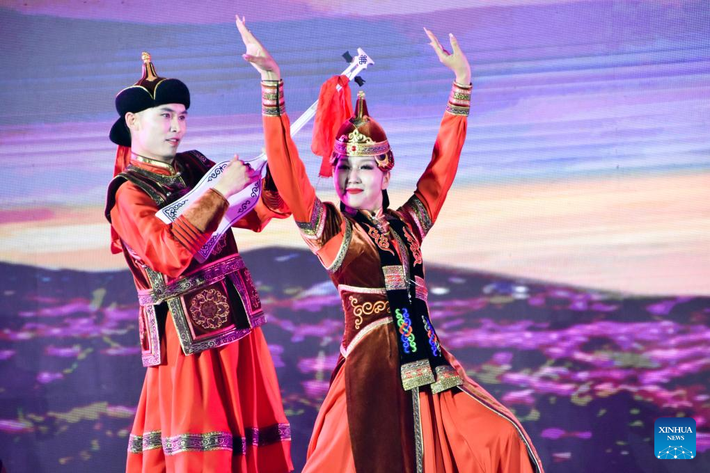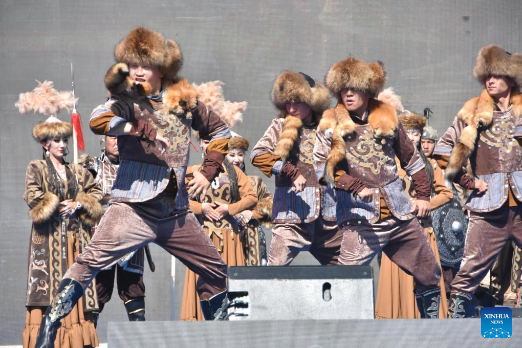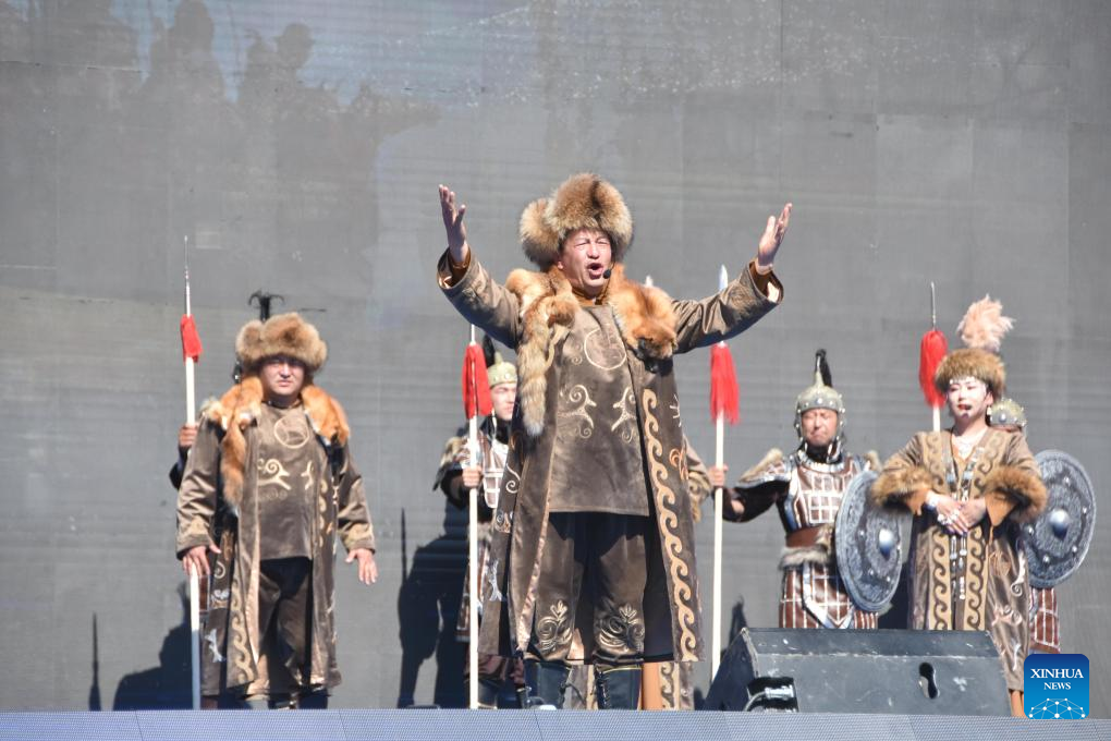Artists perform in the Mongolian ethnic epic "Jangar" at the ninth Manas international cultural tourism festival in Kizilsu Kirgiz Autonomous Prefecture, northwest China's Xinjiang Uygur Autonomous Region, July 13, 2023. (Xinhua/Zhang Yu)