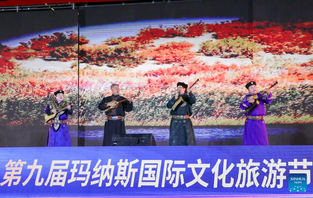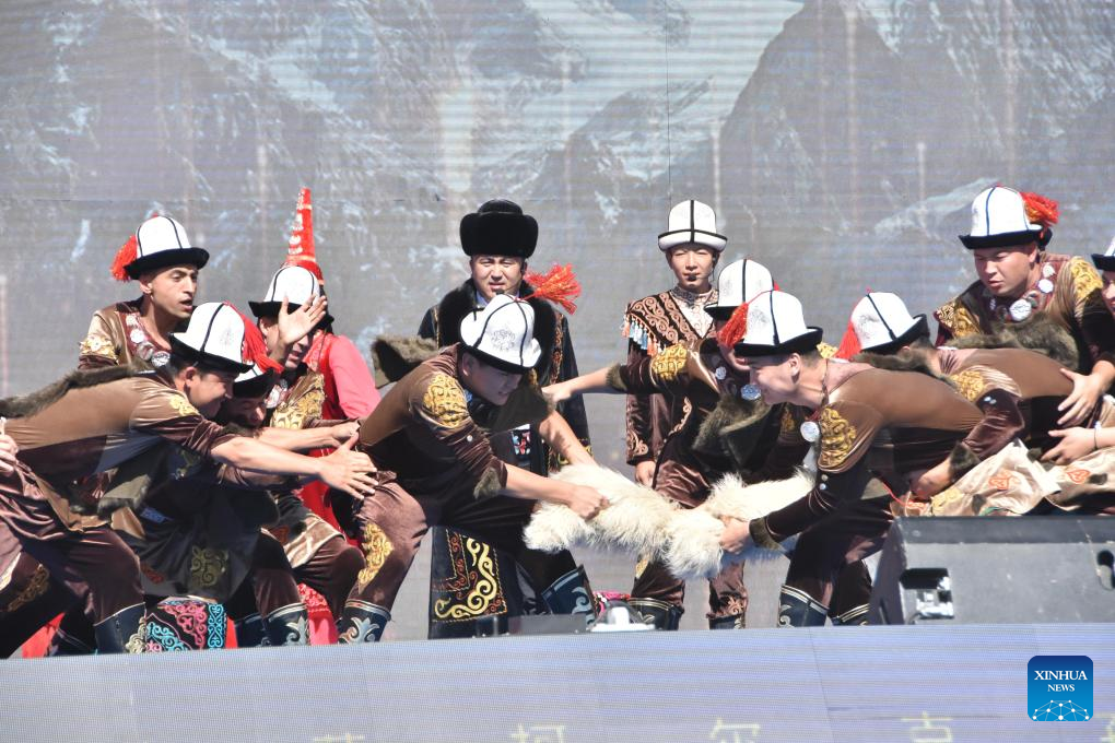 Artists perform the "Manas" epic at the opening ceremony of the ninth Manas international cultural tourism festival in Wuqia County, Kizilsu Kirgiz Autonomous Prefecture in northwest China's Xinjiang Uygur Autonomous Region, July 13, 2023. (Xinhua/Zhao Chenjie)