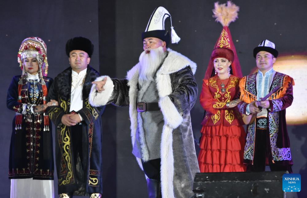 Artists perform the "Manas" epic at the opening ceremony of the ninth Manas international cultural tourism festival in Wuqia County, Kizilsu Kirgiz Autonomous Prefecture in northwest China's Xinjiang Uygur Autonomous Region, July 13, 2023. (Xinhua/Zhang Yu)