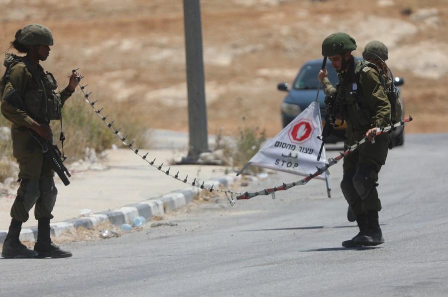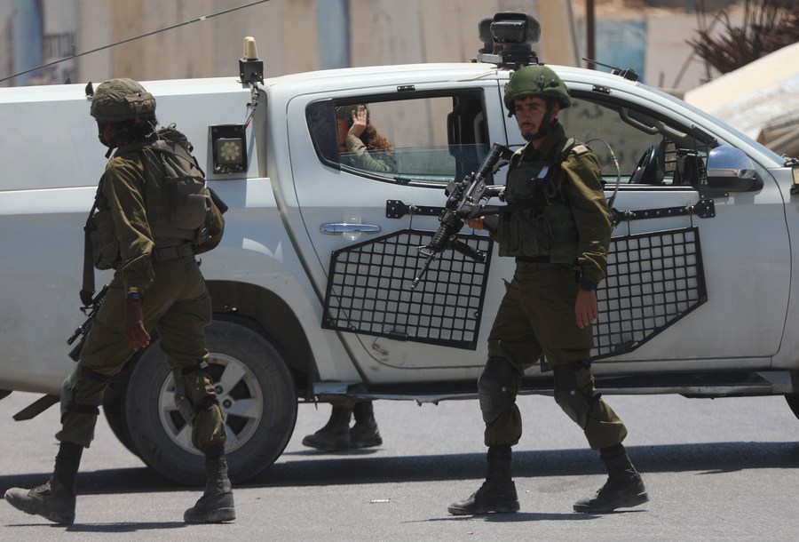 Israeli soldiers are seen near the scene of a shooting attack at Tekoa Junction, south of the West Bank city of Bethlehem, July 16, 2023. (Photo by Mamoun Wazwaz/Xinhua)