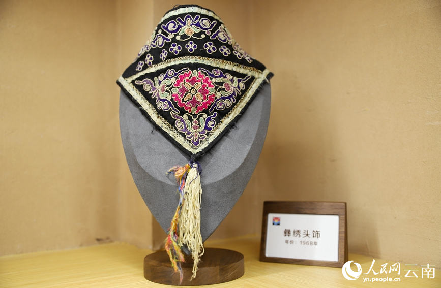 A Yi embroidered headwear at an exhibition featuring Yi embroidery in Nanhua county, Chuxiong Yi Autonomous Prefecture, southwest China's Yunnan Province. (People's Daily Online/Hu Zunhui)