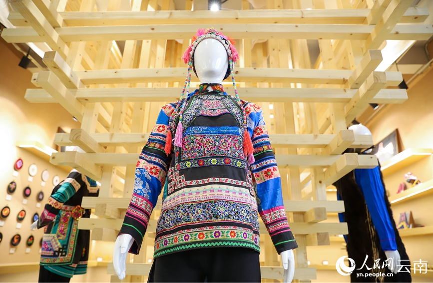 A costume of Yi embroidery at an exhibition featuring Yi embroidery in Nanhua county, Chuxiong Yi Autonomous Prefecture, southwest China's Yunnan Province. (People's Daily Online/Hu Zunhui)