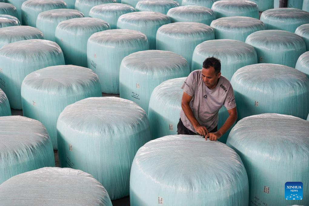 This photo taken on July 14, 2023 shows bales of haylage at Nepal Horizon International Pvt. Ltd. in Bharatpur, Nepal. Ten trucks set out on Saturday from Bharatpur in southern Nepal, shipping the first batch of haylage for export to China's Tibet Autonomous Region. A total of 80 tons of silage, produced by Nepal Horizon International Pvt. Ltd. with green maize, shall land in the Tibetan city of Shigatse to feed animals in winter.(Photo by Hari Maharjan/Xinhua)