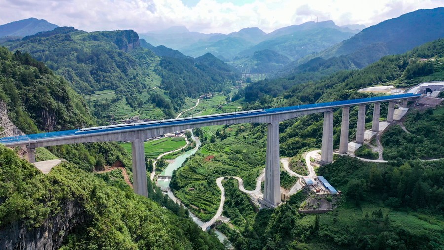 A test train passes a grand bridge in Guiding County, southwest China's Guizhou Province, June 26, 2023. (Photo by Long Jianrui/Xinhua)