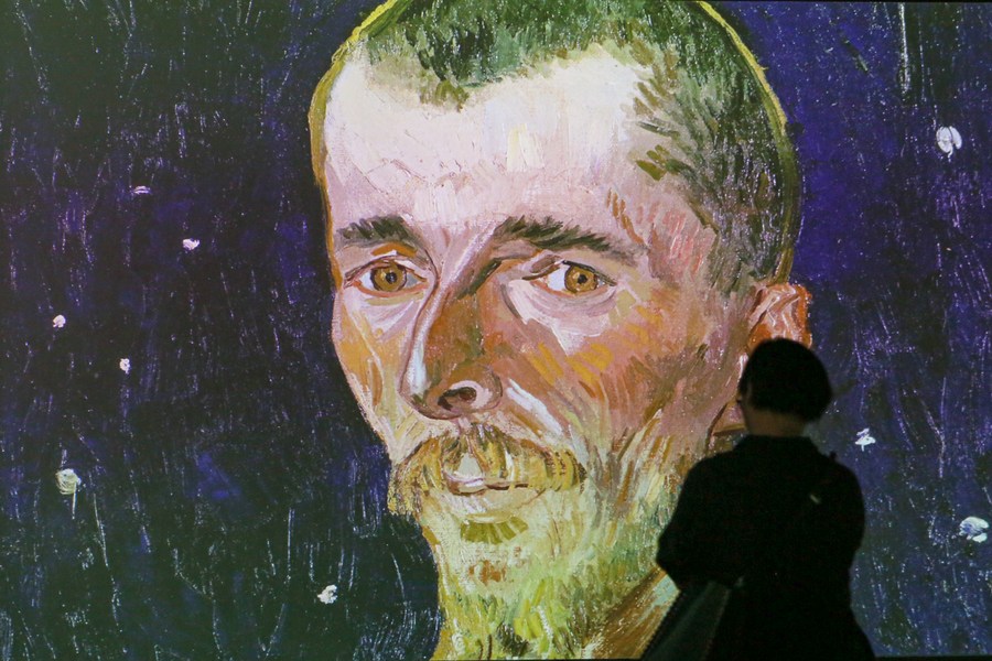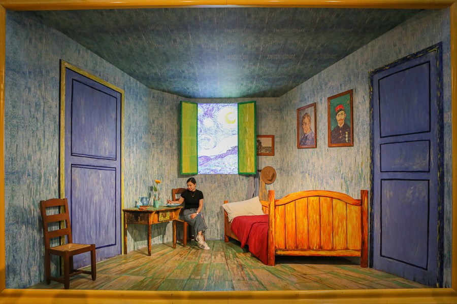 A visitor is seen during the immersive exhibition "Van Gogh Alive: the experience" at the World Expo Museum at night in Shanghai, east China, July 16, 2023. (Xinhua/Xin Mengchen)