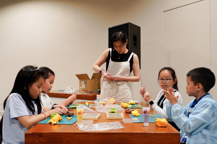 Children make sunflower-themed clay photo frames at the World Expo Museum at night in Shanghai, east China, July 16, 2023. (Xinhua/Xin Mengchen)
