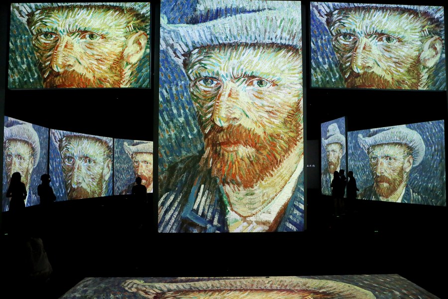People visit the immersive exhibition "Van Gogh Alive: the experience" at the World Expo Museum at night in Shanghai, east China, July 16, 2023. (Xinhua/Xin Mengchen)