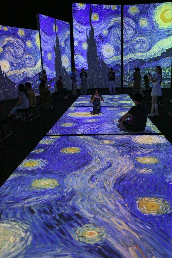 People visit the immersive exhibition "Van Gogh Alive: the experience" at the World Expo Museum at night in Shanghai, east China, July 16, 2023. (Photo by Li Xinyi/Xinhua)