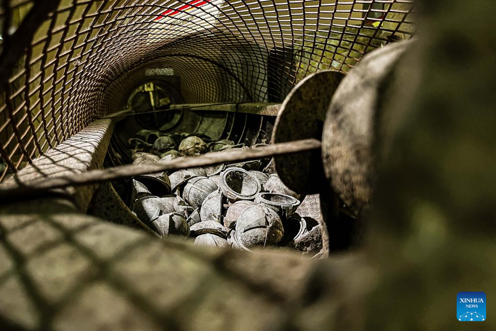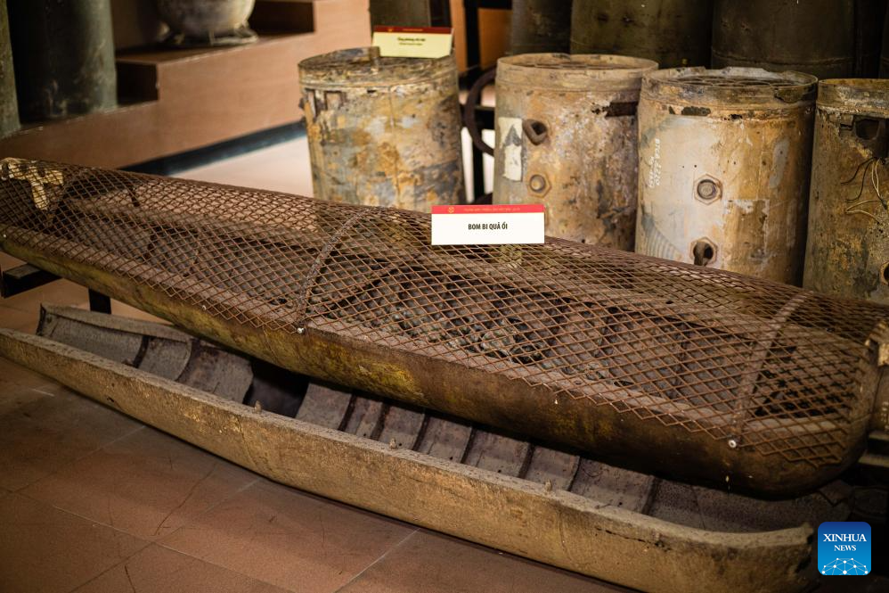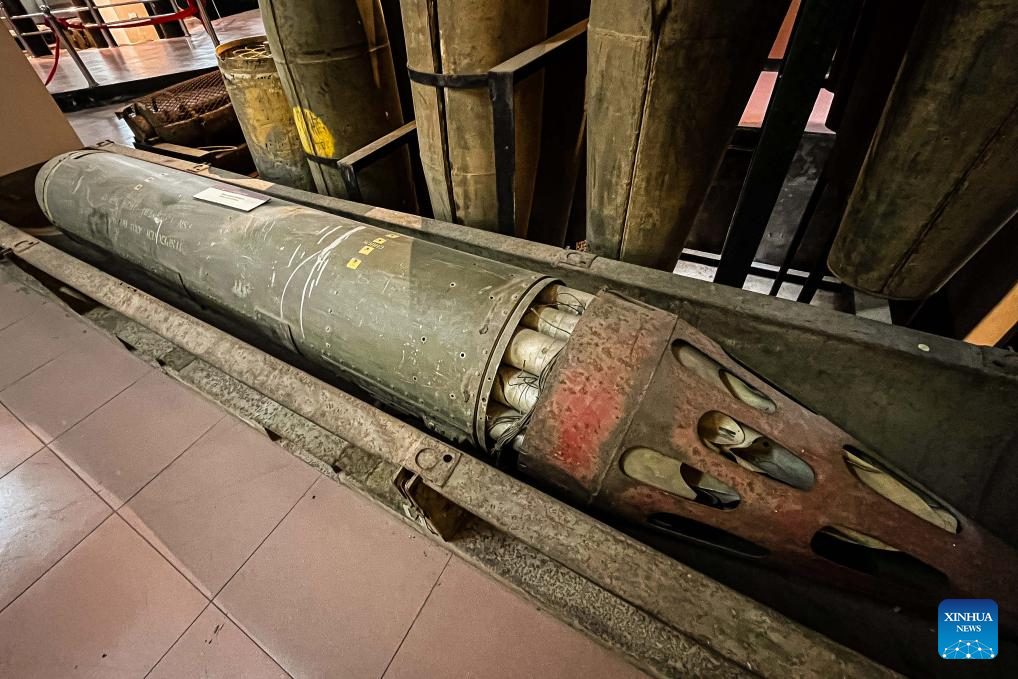 This photo taken on July 14, 2023 shows cluster bomblets left by the U.S. military during the Vietnam war at a museum in Hanoi, Vietnam.(Photo by Pham Dinh Duc/Xinhua)