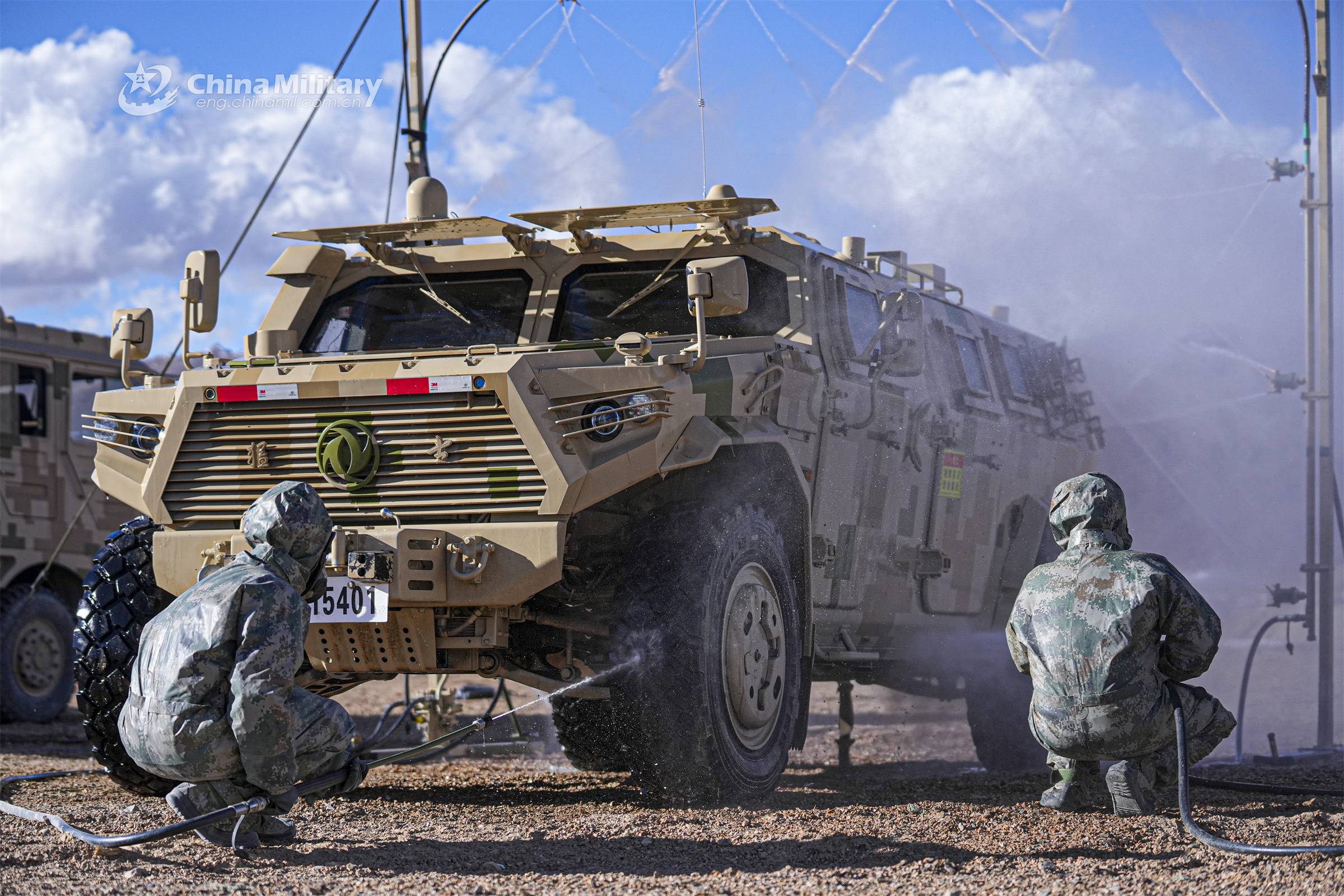 Two soldiers in chemical protective gears use a pressing washing system to decontaminate a military vehicle during a comprehensive chemical training exercise on July 5, 2023. (eng.chinamil.com.cn/Photo by Feng Chiyu)