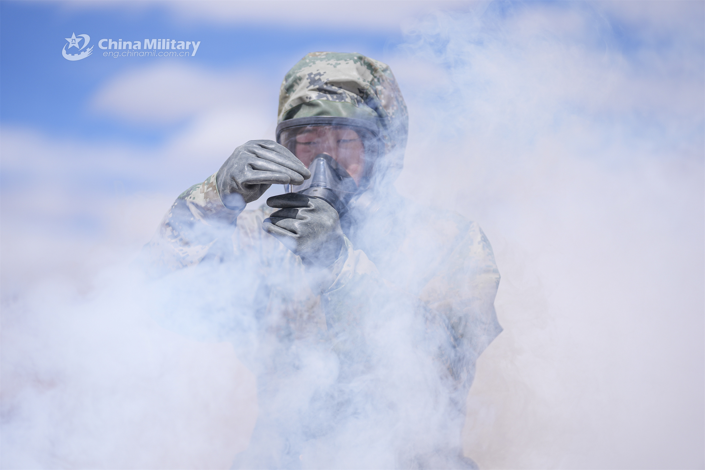 A soldier in chemical protective gear tests a contamination sample during a comprehensive chemical training exercise on July 5, 2023. (eng.chinamil.com.cn/Photo by Feng Chiyu)