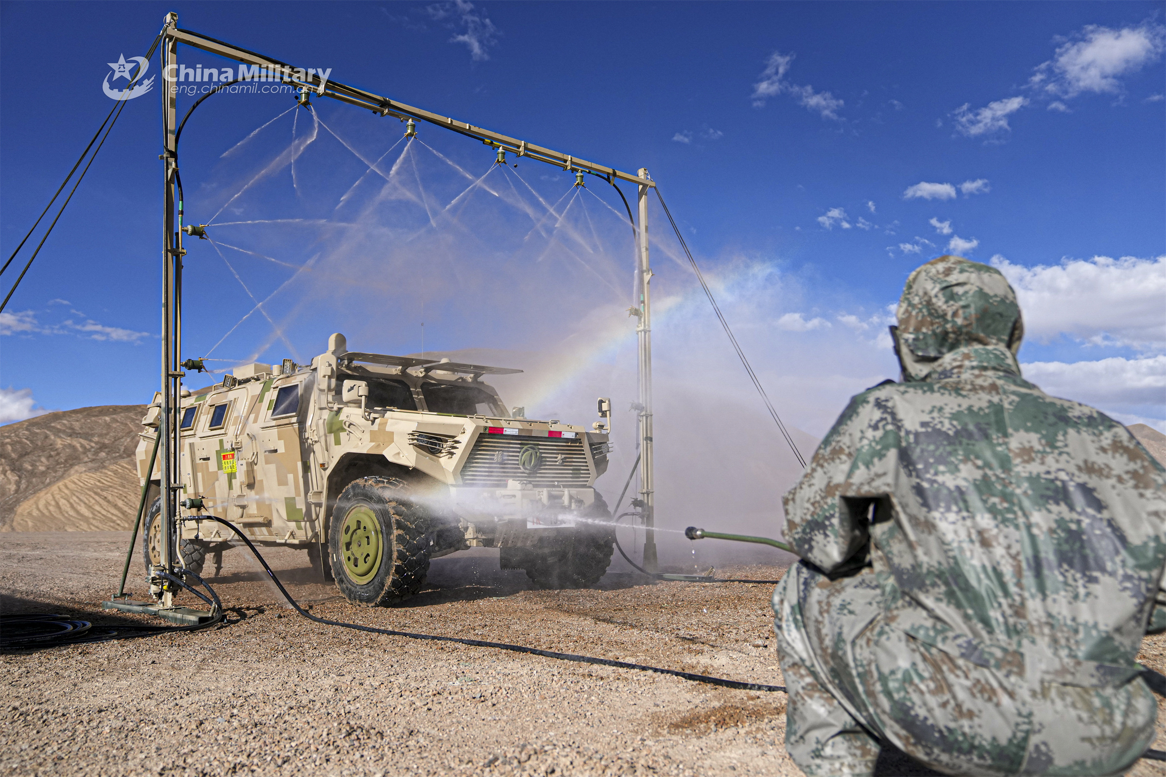 A soldier in chemical protective gear uses a pressing washing system to decontaminate a military vehicle during a comprehensive chemical training exercise on July 5, 2023. (eng.chinamil.com.cn/Photo by Feng Chiyu)